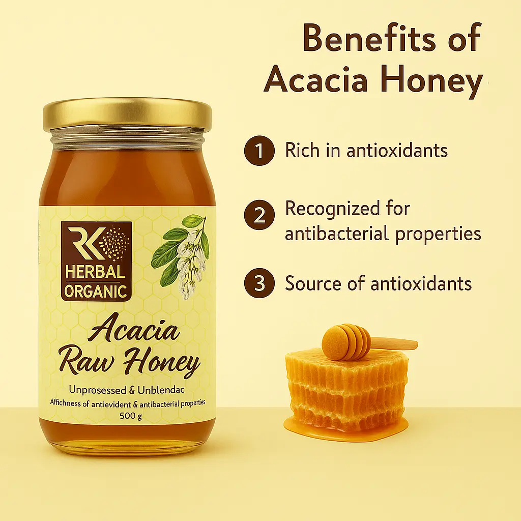 Acacia honey, made from the nectar of Acacia tree blossoms, is a light, mild-flavored honey known for its numerous health benefits. It is rich in antioxidants and has antibacterial properties that boost immunity and promote wound healing. Acacia honey supports digestive health, helps regulate blood sugar levels due to its low glycemic index, and provides a natural energy boost. It also soothes sore throats, improves skin health, and enhances overall well-being. Being less likely to crystallize, it remains liquid for a long time, making it convenient to use.
