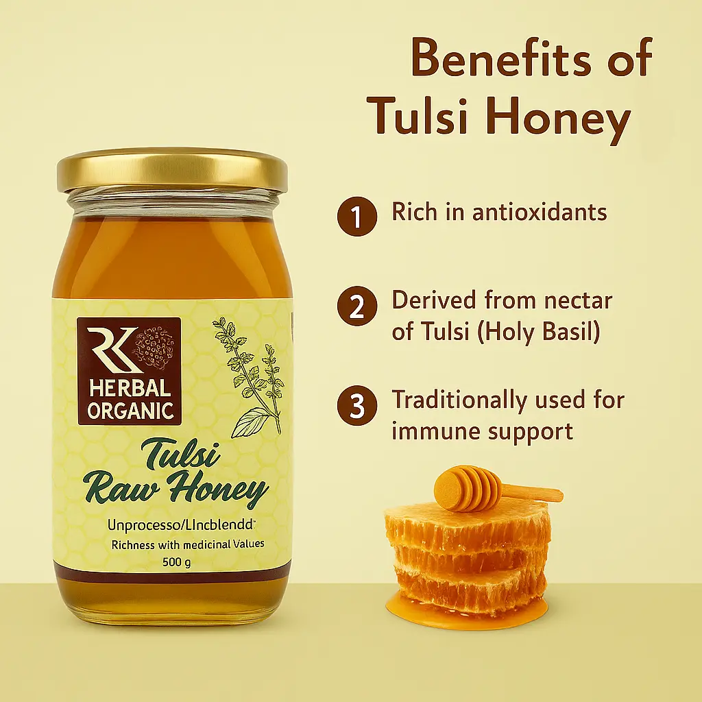 Tulsi honey offers a wide range of health benefits. It boosts immunity, helps fight infections, and supports respiratory health by relieving cough, cold, and sore throat. Rich in antioxidants, it reduces oxidative stress and promotes overall wellness. Tulsi honey also aids digestion, enhances skin health, and provides a natural energy boost. Additionally, it helps manage stress and supports heart health by improving circulation and reducing inflammation. Consuming raw, unprocessed Tulsi honey ensures maximum benefits.